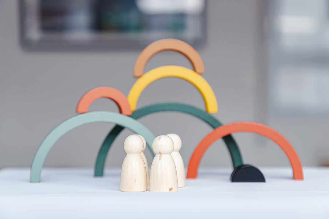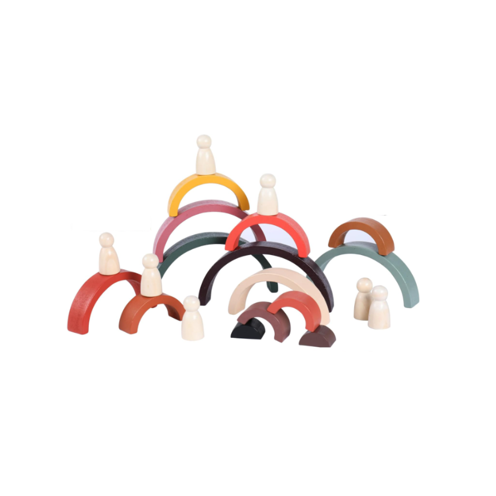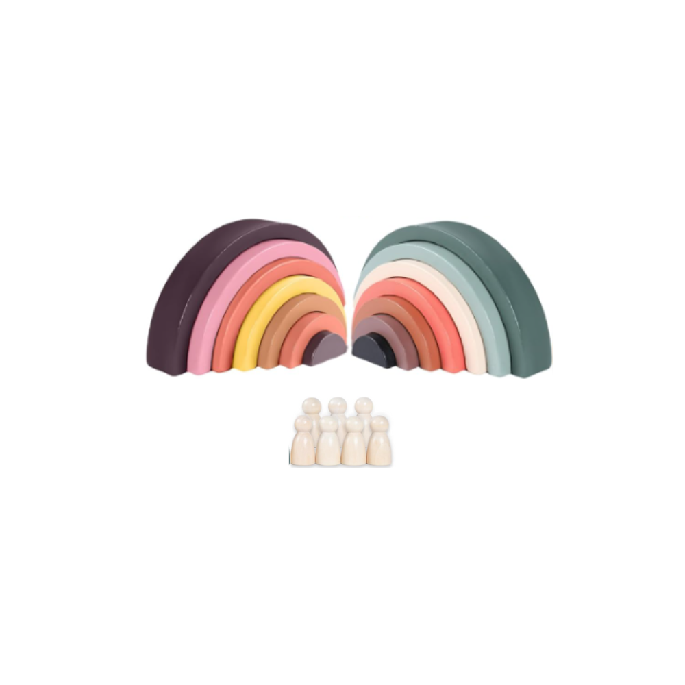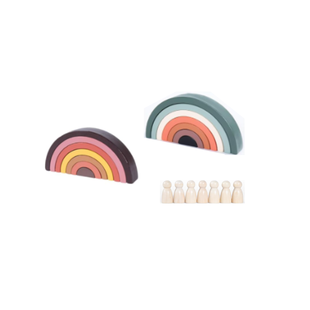 Este conjunto inclui dois arco-íris e sete bonecos de madeira cuidadosamente fabricados com materiais naturais e sustentáveis. Este kit oferece um encanto atemporal, perfeito para brincadeiras que transcendem gerações. Os bonecos são polidos e projetados para mãos pequenas, incentivando brincadeiras imaginativas e duradouras.