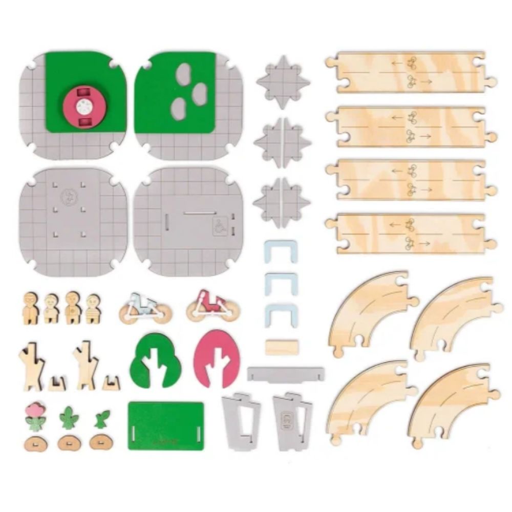 O conjunto Cidade Sustentável – Ciclovia e Praça convida a criança a criar e explorar espaços urbanos pensados para a convivência e a mobilidade consciente. Com ciclovia, bicicletário, ponto de ônibus, praça com gira-gira, bicicletas, árvores, plantinhas em crescimento e bonequinhos, o brincar ganha significado ao representar o dia a dia nas cidades de forma lúdica e criativa.