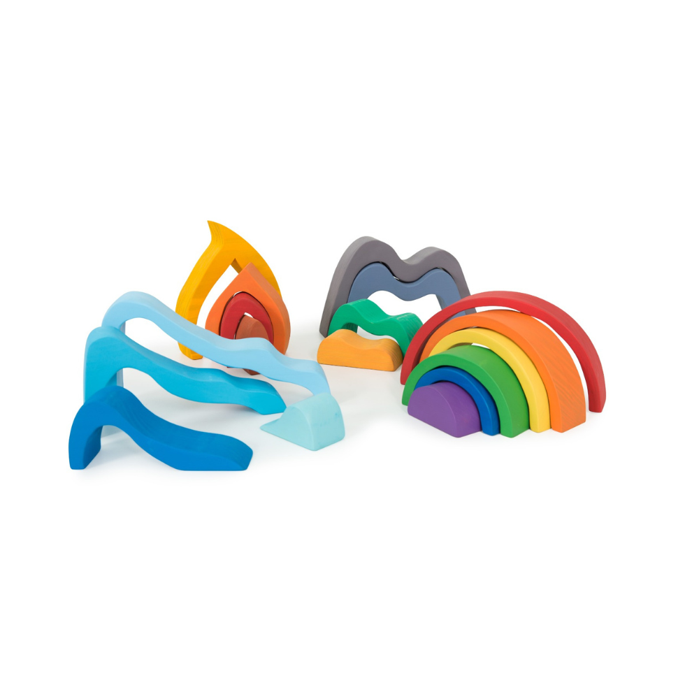 Conjunto dos 4 Elementos da Natureza em madeira: água, terra, ar e fogo. Deixe que os quatro elementos ar, fogo, água e terra, sejam companheiros de brincadeira de seus filhos, você estará oferecendo um presente a eles. O ar nos move. O fogo nos transforma. A água nos molda. A terra nos cura. Baseado nos princípios da Pedagogia Waldorf, o conjunto de 4 Elementos da Natureza representa um brinquedo versátil, desenvolvido para estimular brincadeiras criativas e aprimorar habilidades motoras finas, bem como a imaginação. Além disso, contribui para a aprendizagem das cores, construção, contagem, equilíbrio, diferenciação de tamanhos (grande-médio-pequeno) e reconhecimento de simetrias (ao posicionar os arcos sobre um espelho). As crianças têm a liberdade de empilhar as peças ou criar diversas estruturas, como pontes, túneis, montanhas, casas e tudo o mais que possa surgir em sua mente criativa.
