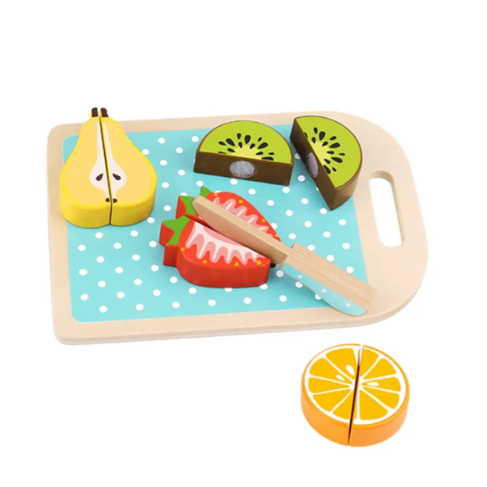 O Cortando Frutas de Madeira transforma a brincadeira em uma experiência educativa e divertida. Composto por uma tábua, uma faca de madeira e quatro frutas (morango, pera, kiwi e laranja), o kit permite que as crianças "cortem" os alimentos graças às partes unidas por velcro, que podem ser separadas e remontadas facilmente.