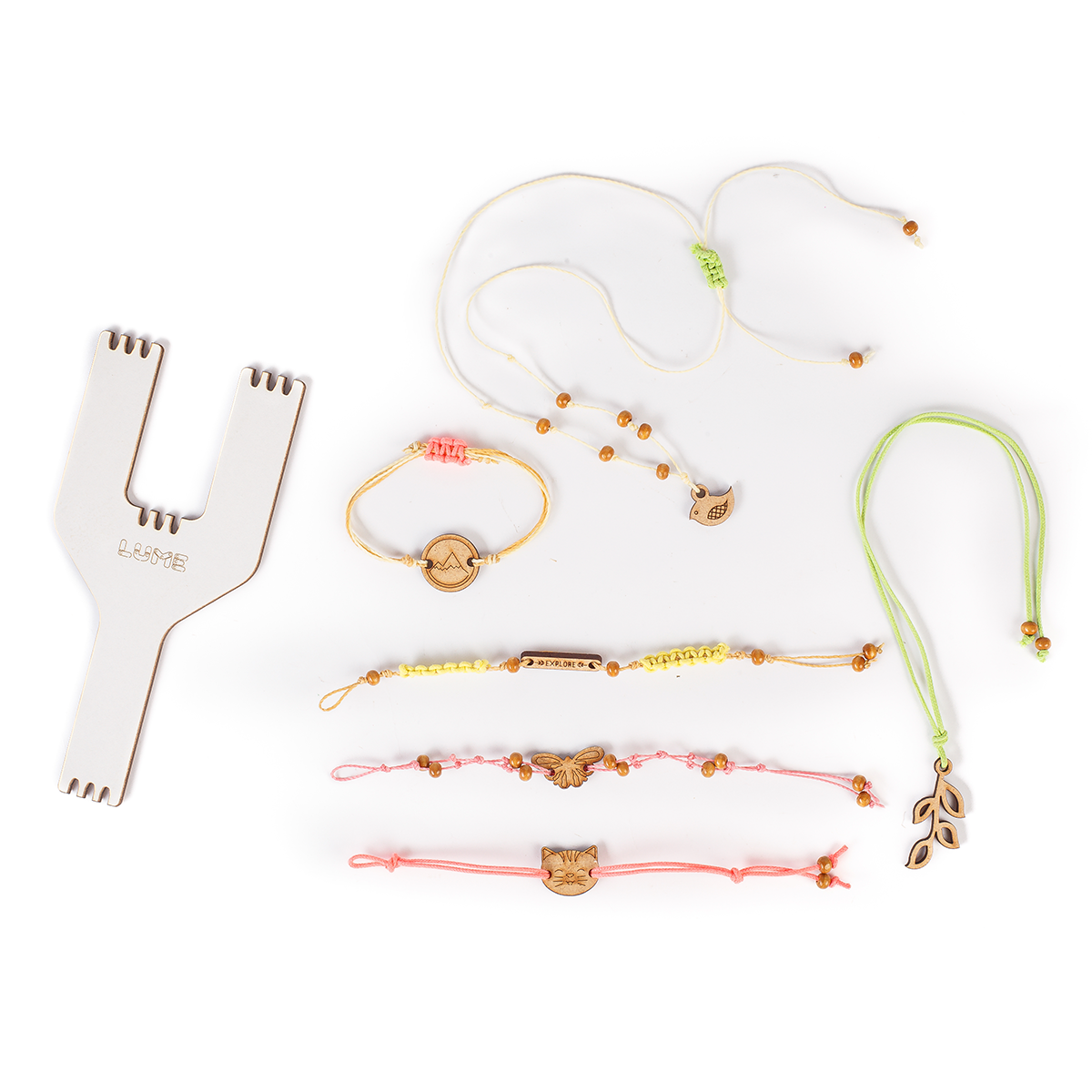 Contém fios, pingentes, miçangas e acessórios diversos, produzidos com materiais seguros e resistentes para a manipulação infantil.