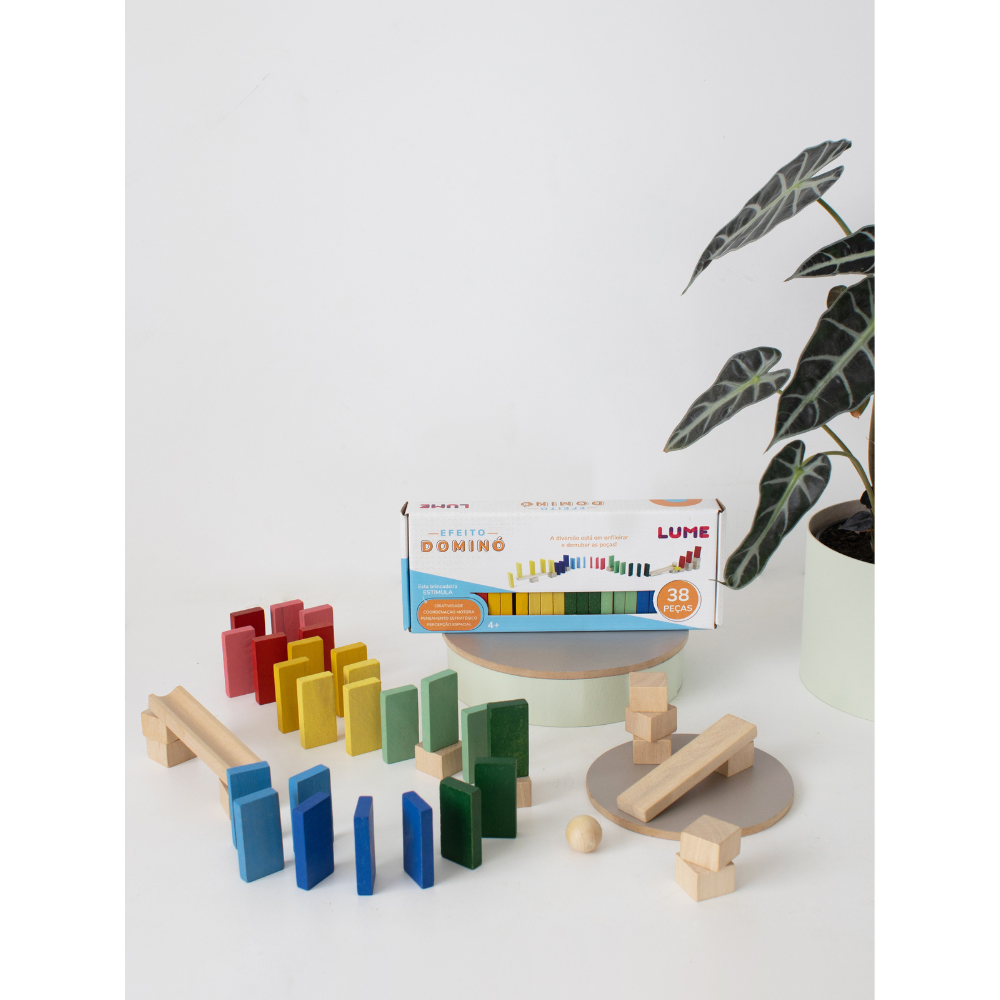 O Efeito Dominó 38 Peças da Lume é um brinquedo educativo que transforma a brincadeira em uma experiência de aprendizado. Com peças de madeira, as crianças podem montar diferentes sequências e observar o efeito dominó ao derrubar a primeira peça, estimulando criatividade, percepção espacial, paciência, motricidade fina e pensamento estratégico. Compatível com outros brinquedos Lume, permite criar circuitos e desafios ainda mais complexos.