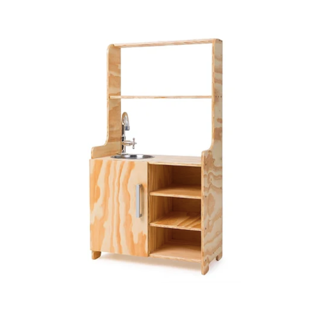 Feita em madeira de pinus com acabamento em verniz atóxico, ela traz detalhes realistas como cuba de alumínio e torneira em plástico com acabamento metálico, estimulando a imaginação e o brincar simbólico de forma segura e encantadora.