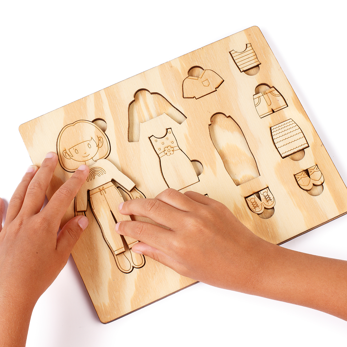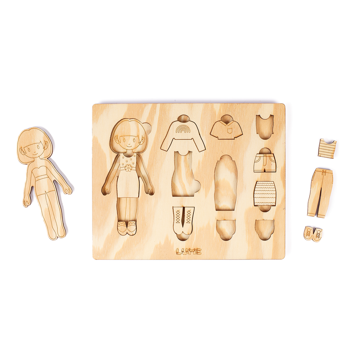 Laminado de madeira. Contém 12 peças para vestir e pintar.