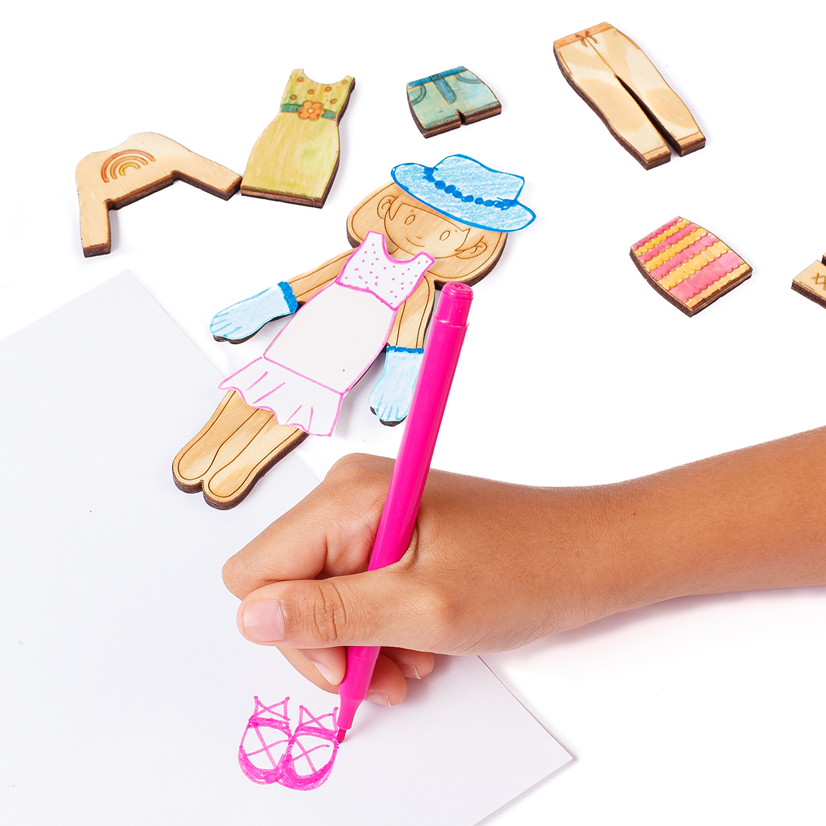 O Meu Guarda-Roupa permite que as crianças combinem, pintem e personalizem peças de roupa, criando visuais únicos. Uma atividade prática e divertida que estimula coordenação motora, senso estético, criatividade e autonomia nas escolhas. Este brinquedo NÃO acompanha as canetinhas.