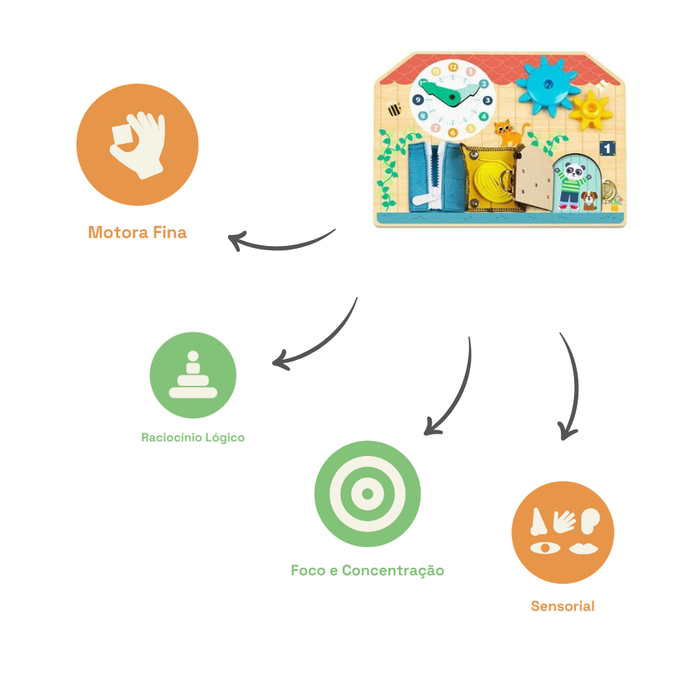O Quadro Atividades foi criado para acompanhar as descobertas das crianças e estimular habilidades importantes do dia a dia. Com elementos como zíper, botões, encaixes, alavancas e fechos variados, ele convida os pequenos a explorar, testar e entender como cada mecanismo funciona.