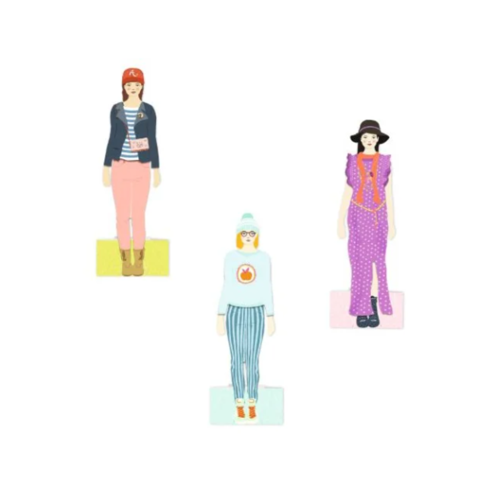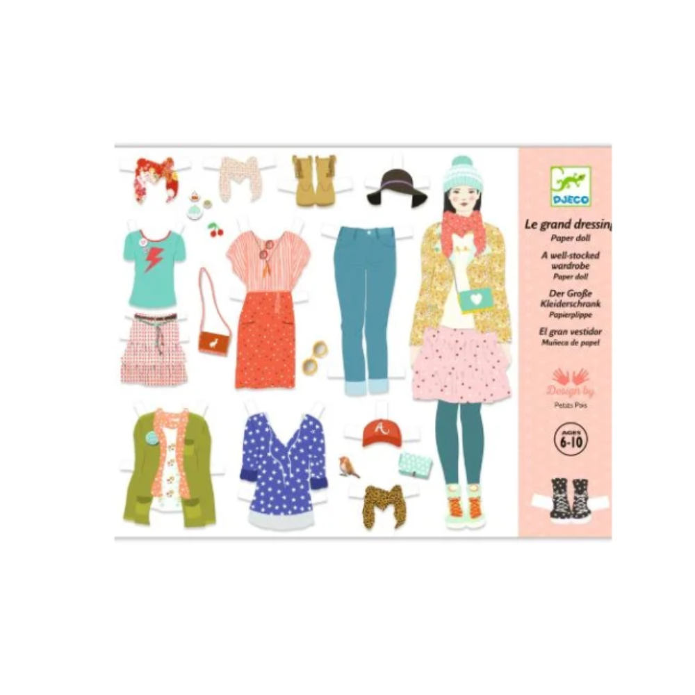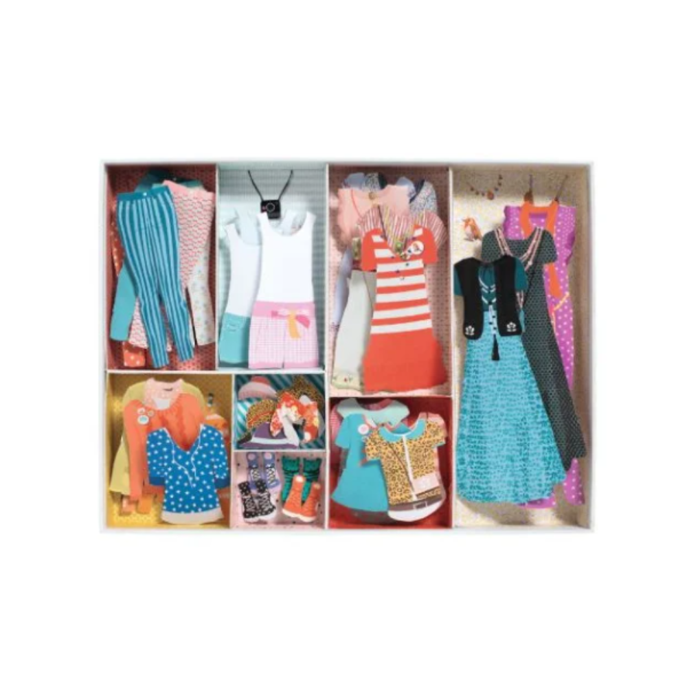 O Quarto de Vestir da marca Djeco é um encantador conjunto de bonecas de papel com roupas e acessórios destacáveis, que convida as crianças a mergulharem no universo da moda e da imaginação. Cada combinação é uma nova criação — basta destacar as peças e inventar diferentes estilos, misturando cores, formas e tendências.