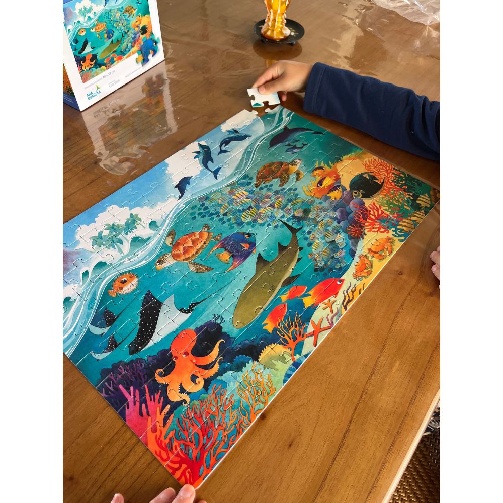 Com 100 peças, o quebra-cabeça estimula o raciocínio lógico, a concentração e a percepção visual, além de incentivar conversas sobre biodiversidade e preservação ambiental. Uma experiência tranquila e significativa para crianças maiores e também para momentos em família.